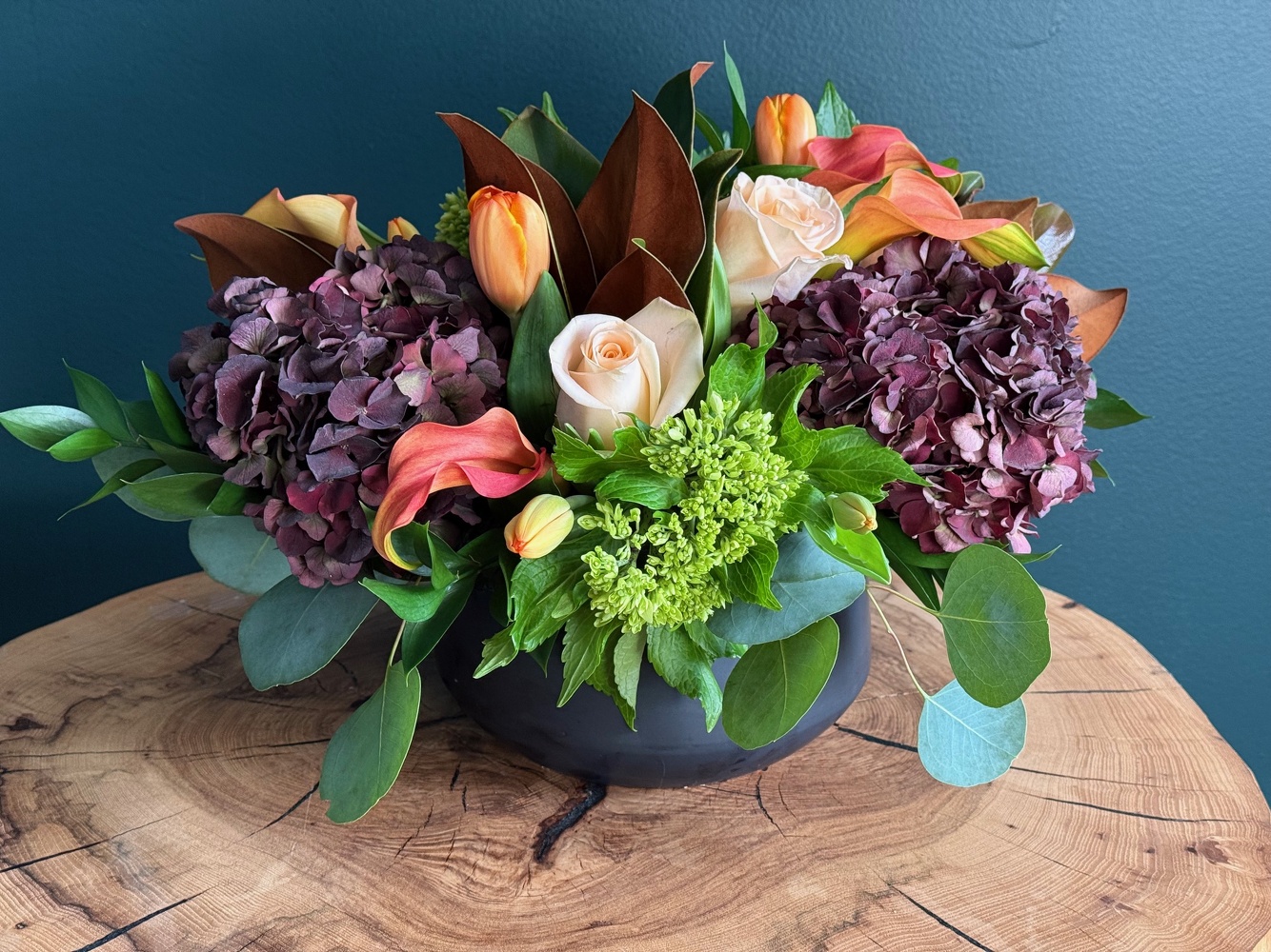hydrangea, calla lilies, tulips, roses, magnolia leaves in a black ceramic container