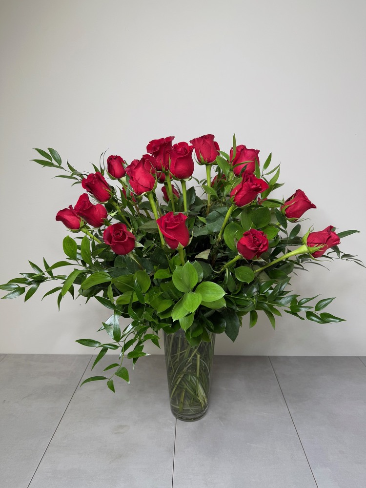 two dozen long stem roses in a tall glass vase with upscale greenery