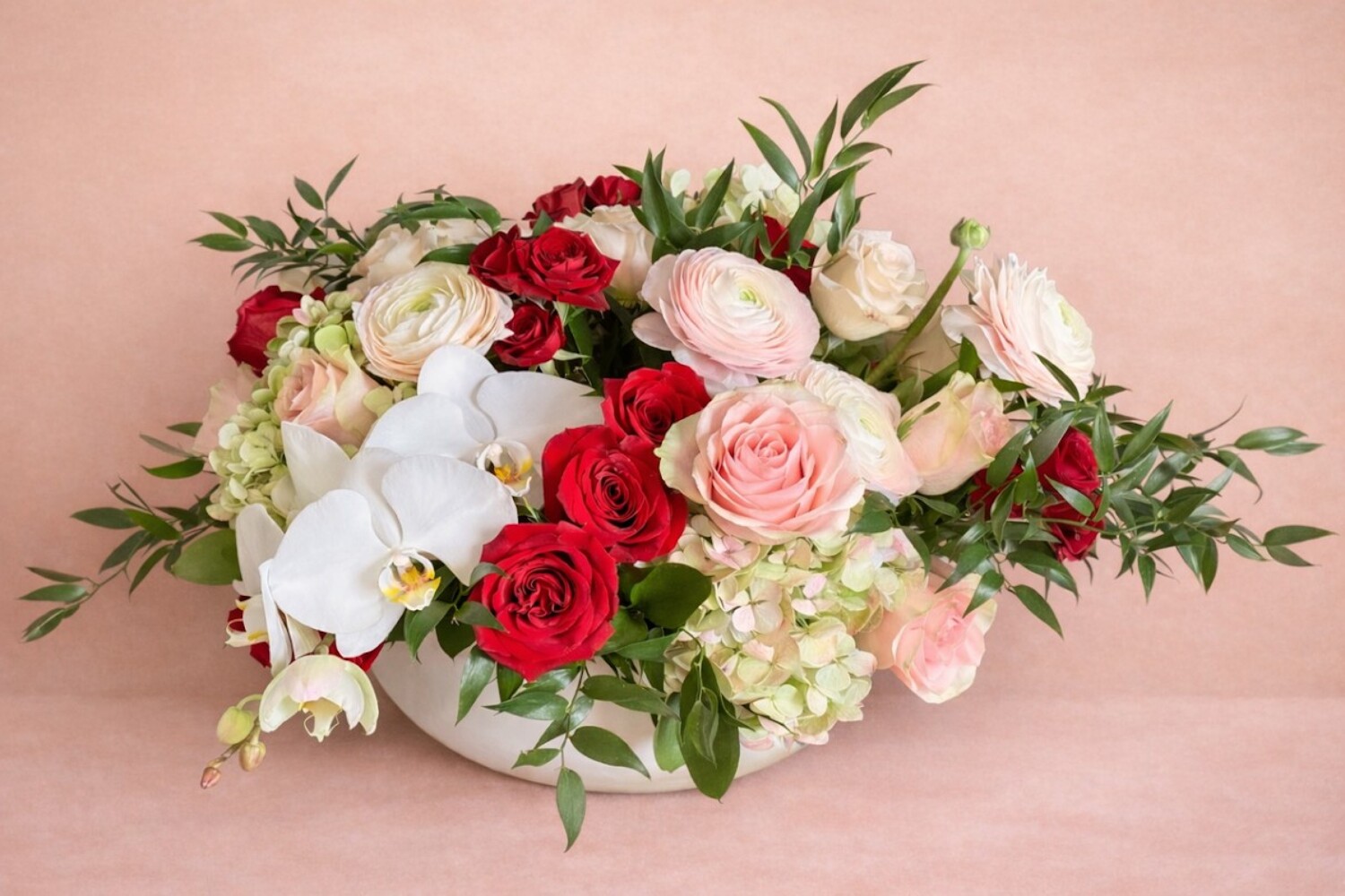 hydrangea, roses, spray roses, ranunculus, and phalaenopsis orchids